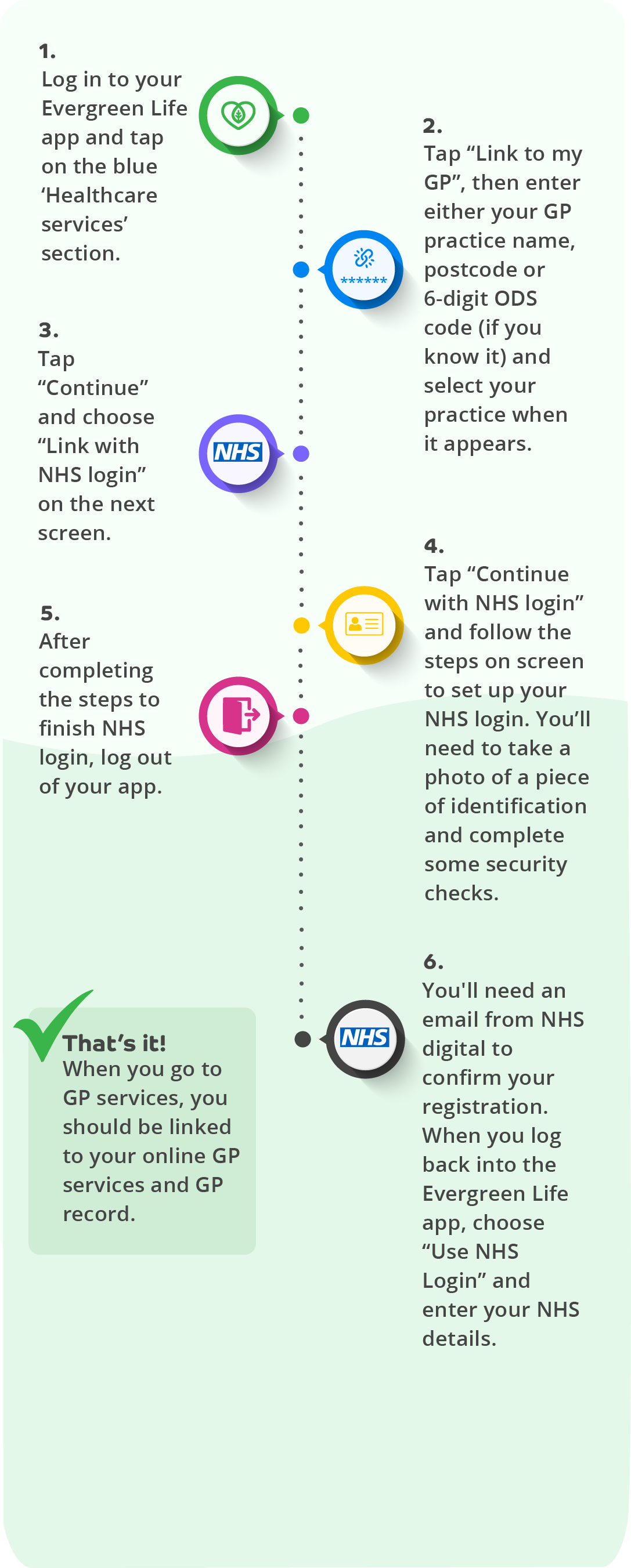 The simplest way to link your app to your GP is to use the NHS login which is available on the Evergreen App. Using NHS login means you don’t have to go through your practice, saving you and them time. You can find out more on the NHS login page linked at the bottom of this article.